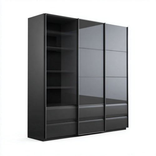 Armadio nero a tre ante scorrevoli in vetro e legno di frassino con cassetti