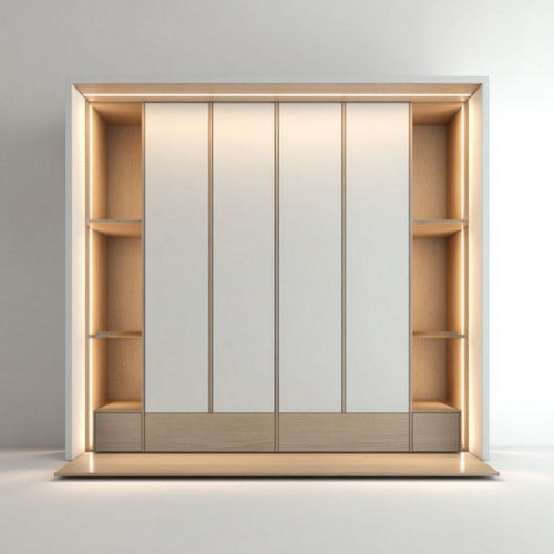 Armadio componibile a quattro ante bianche con vani a giorno laterali e illuminazione LED integrata in legno di frassino